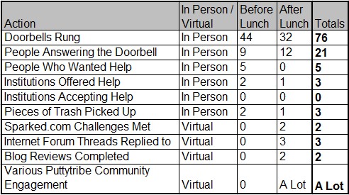 I also didn't do myself any favors by having Help Day on a week day. Many people were at work so I spent a lot of time waiting for doorbells that nobody was going to answer. And a number of the people who did answer were working from home and not in a position to be helped.
